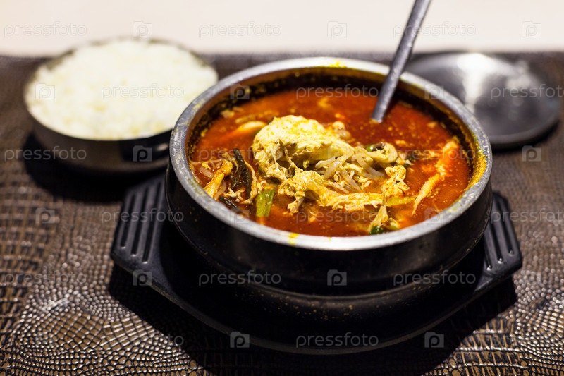 Юкгаежанг (острый суп из говядины) со ложкой и рисом
