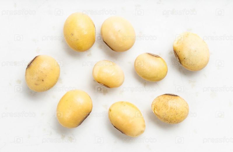 Несколько сырых сушеных соевых бобов крупным планом на сером