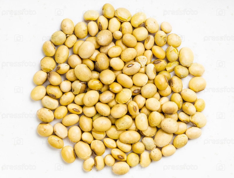 Куча сырых сушеных соевых бобов крупным планом на сером