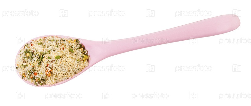 Вид сверху на керамическую ложку с приправленной солью