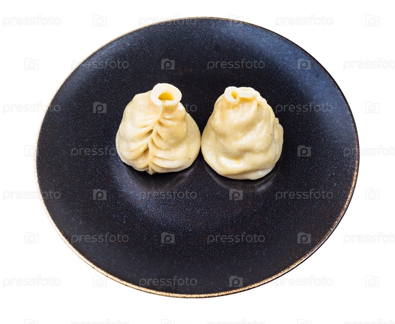 Две вареные пельмени Бууз на темной тарелке изолированы