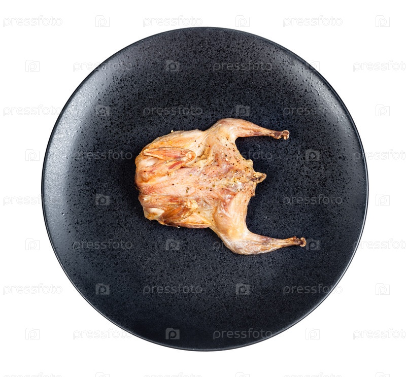 Вид сверху жареного перепела на черной тарелке изолирован