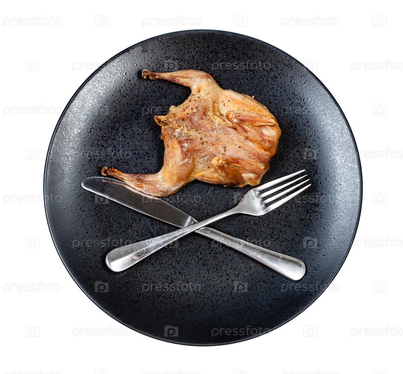 Жареный перепел со скрещенными вилкой и ножом на тарелке