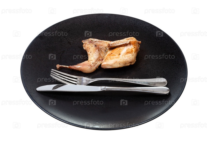 Половина жареного перепела на тарелке с вилкой и ножом