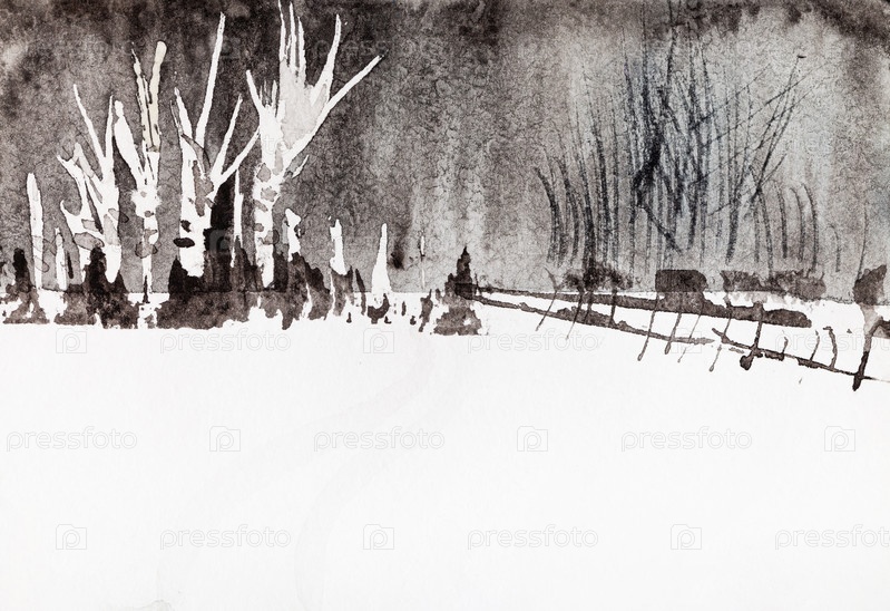 Ручная роспись окраины деревни зимой
