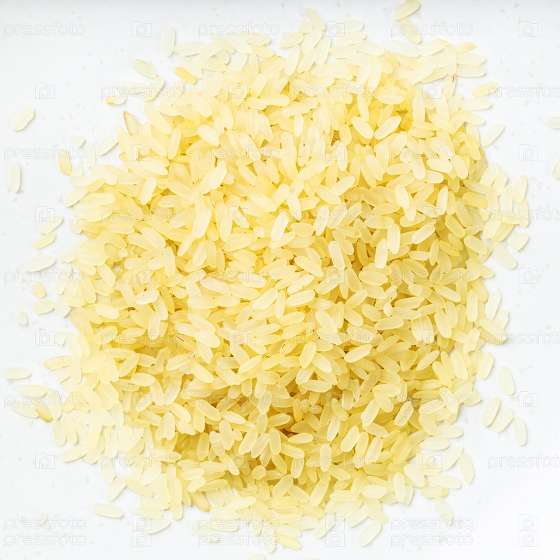 Куча сырого пропаренного риса крупным планом на сером