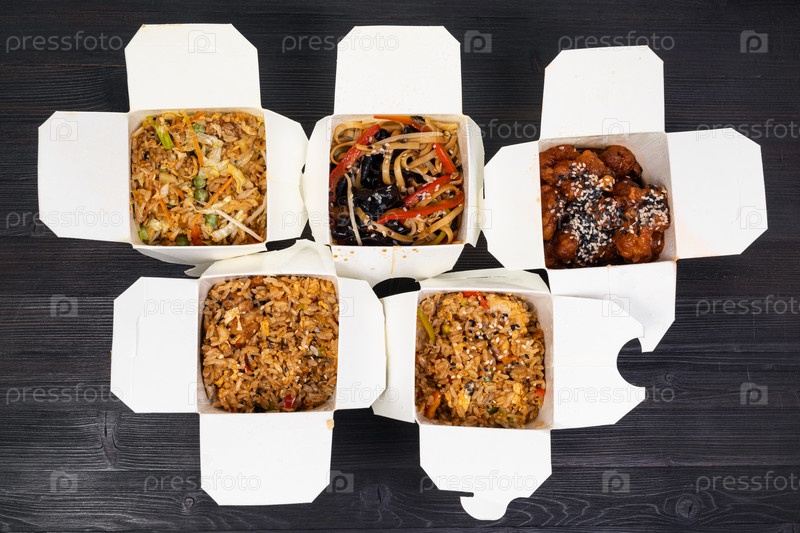 Вид сверху на одноразовые коробки с китайским фастфудом