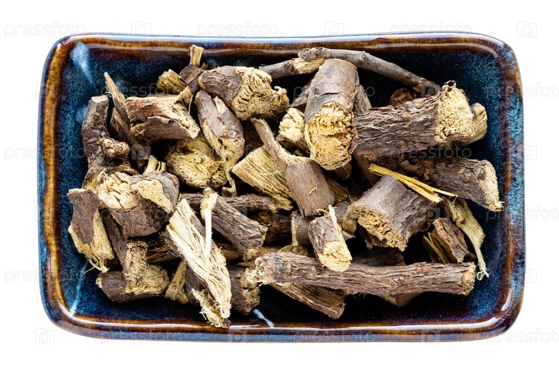 Сушеные корни лакрицы в миске, изолированные на белом фоне