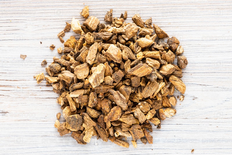 Куча сушеных корней лопуха на серой деревянной доске