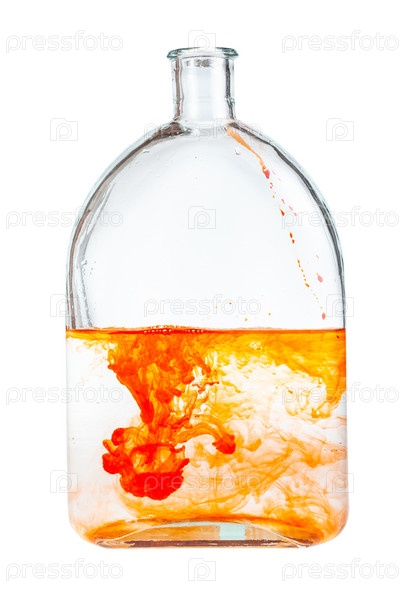 Оранжевая акварельная краска растворяется в стеклянной колбе