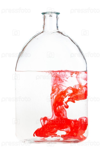 Красная акварель растворяется в воде в стеклянной колбе