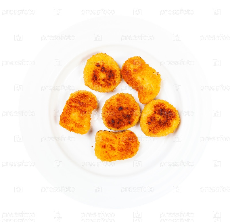 Вид на жареные куриные наггетсы на тарелке изолированы