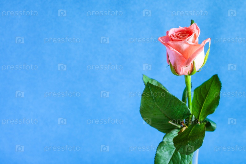 Один свежий розовый цветок розы на синем фоне