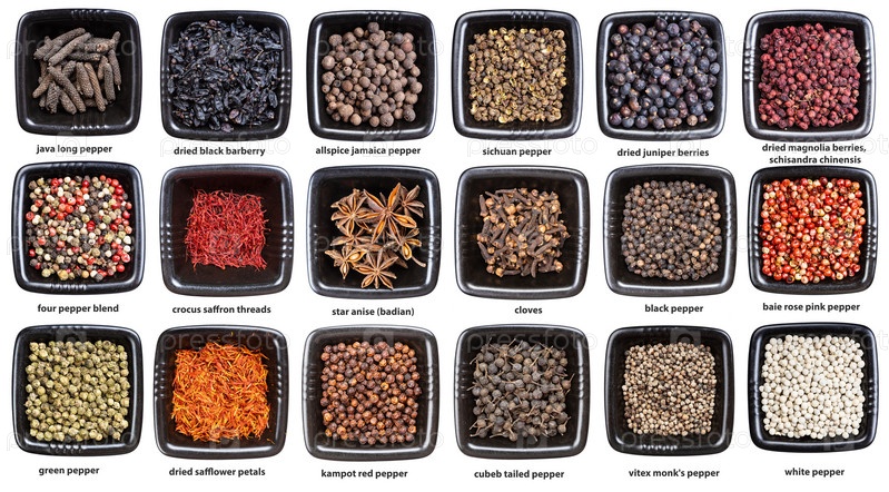 Набор черных мисок с различными специями с именами