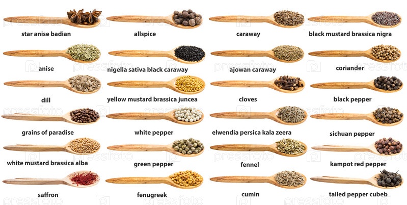 Набор различных специй в деревянной ложке с именами