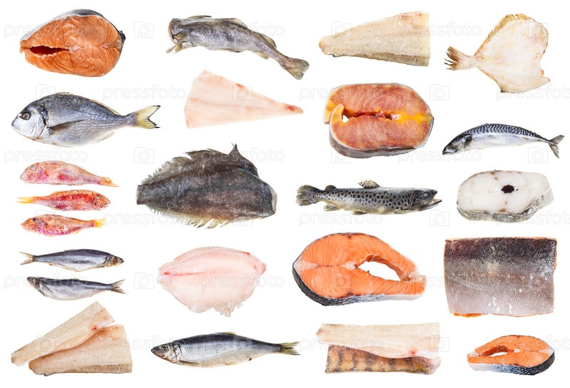 Набор различных замороженных рыб и стейков изолированы