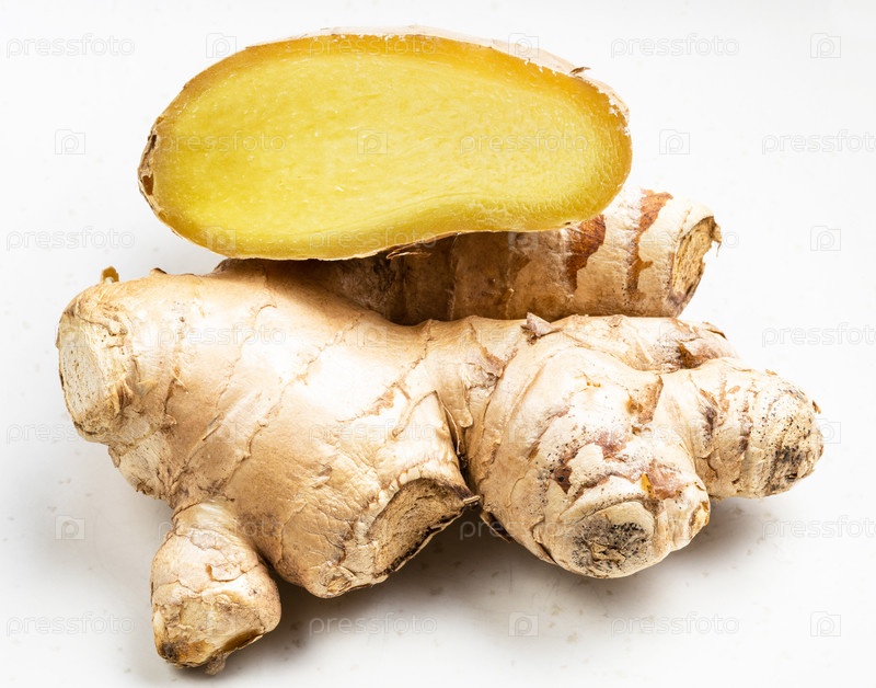 Натуральные свежие целые и нарезанные корни имбиря на сером