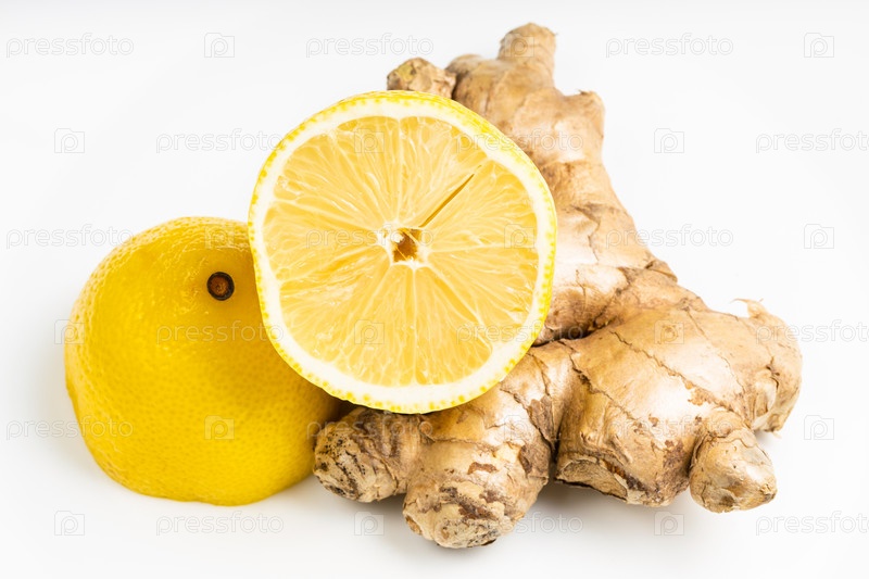 Натуральный свежий цельный корень имбиря и половинка лимона
