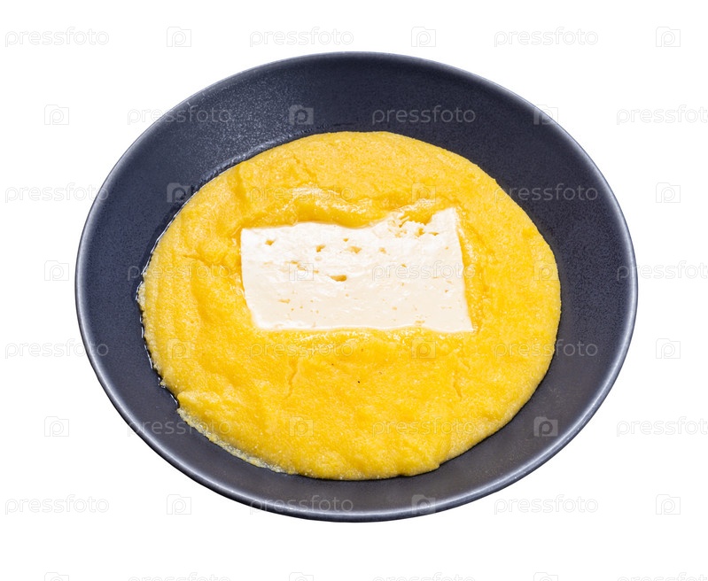 Вареная кукурузная каша с кусочком рассольного сыра