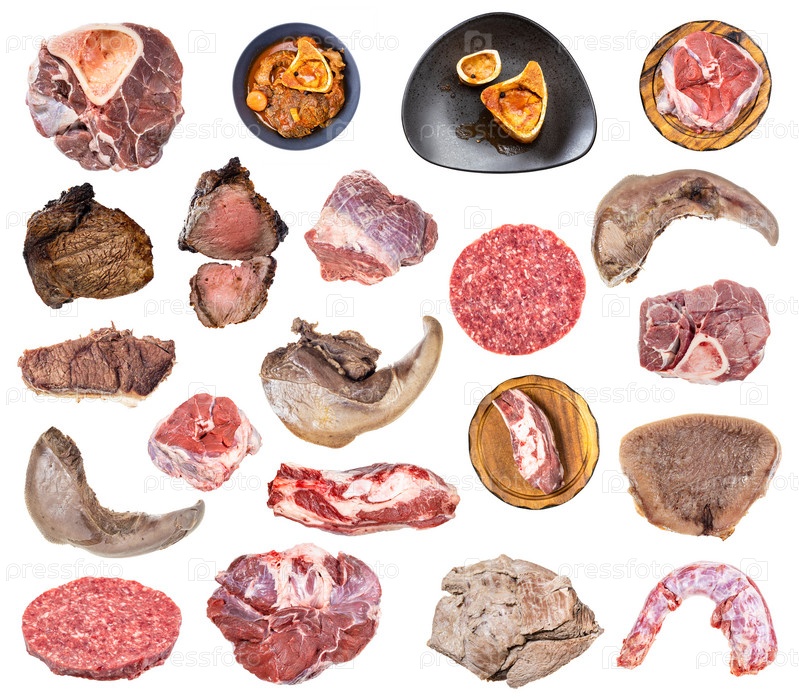 Набор сырого и вареного мяса говядины изолирован