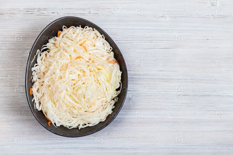 Вид квашеной капусты в миске на сером с копирайтом