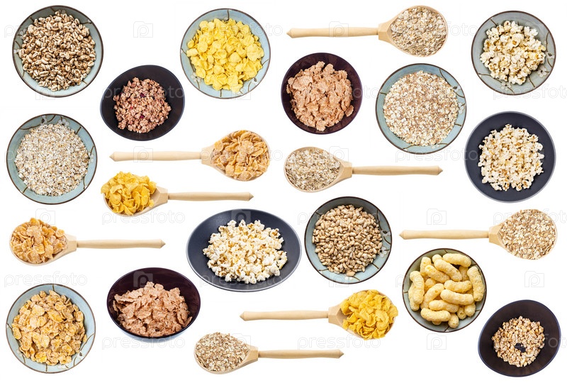 Набор различных сухих хлопьев, изолированных на белом