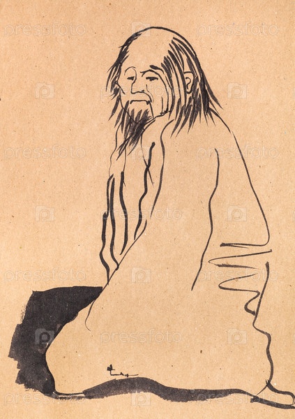 Сидящий китайский старик рисованной в стиле суми-э