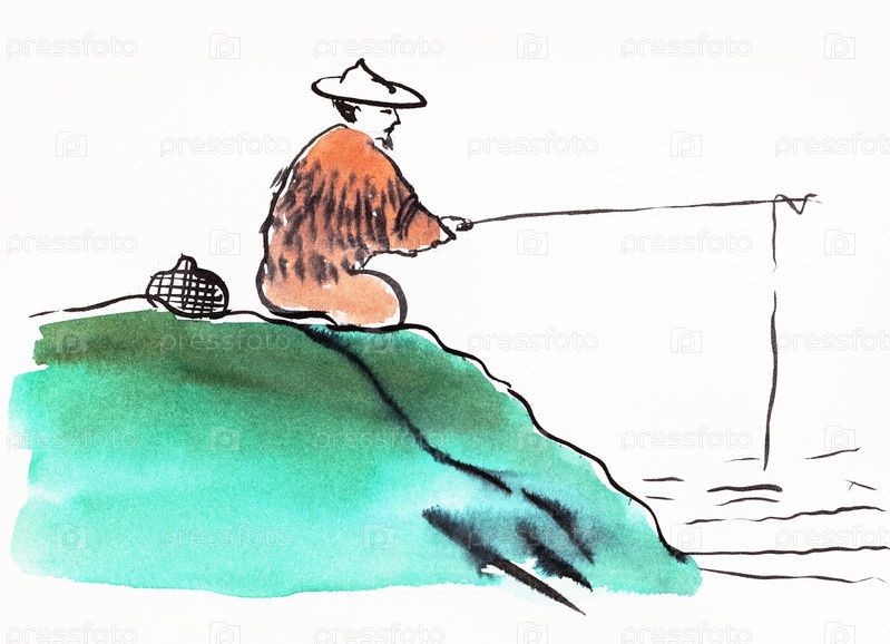 Рыбак ловит рыбу рисованной в стиле суми-э