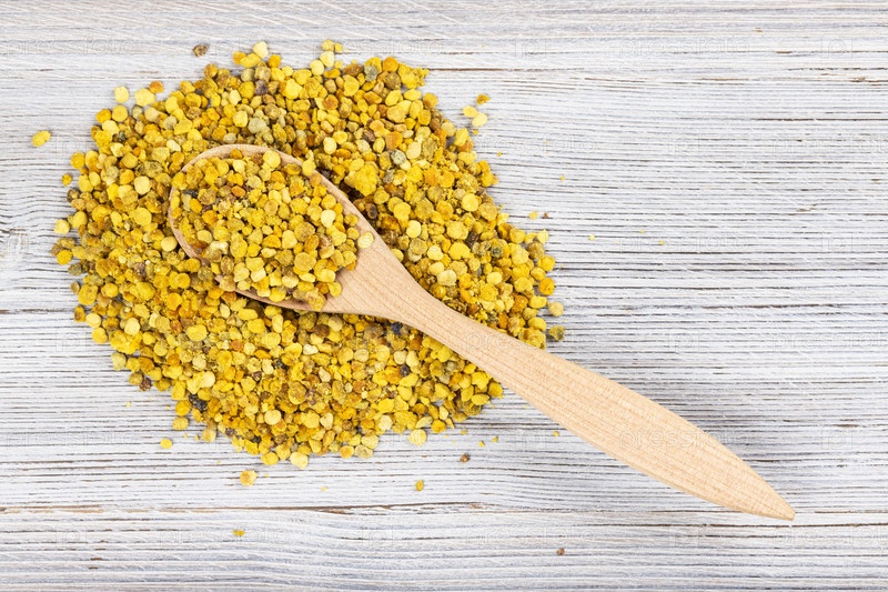 Ложка в куче натуральной пчелиной пыльцы на сером столе