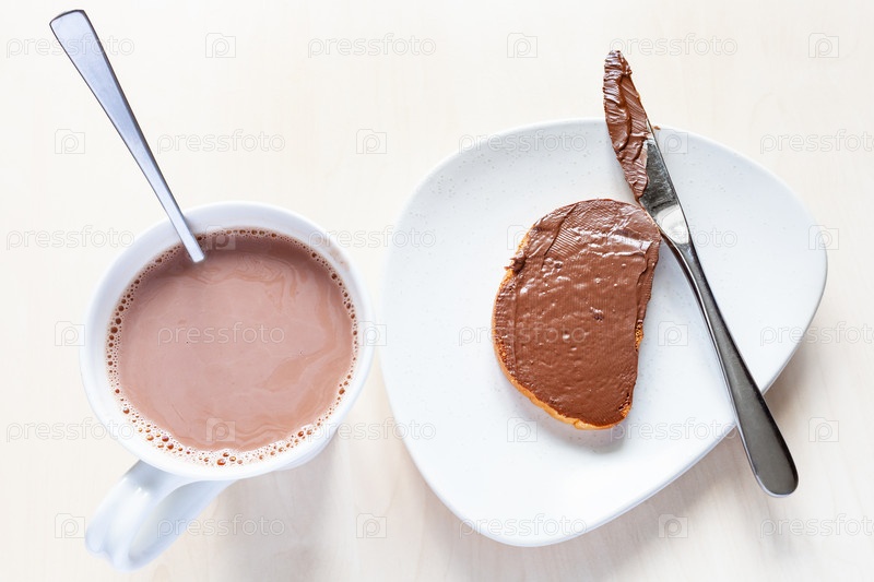 Чашка с какао и тост с шоколадной пастой