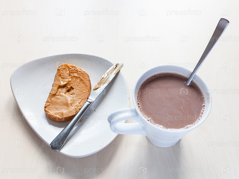 Кружка с шоколадом и тост с арахисовым маслом