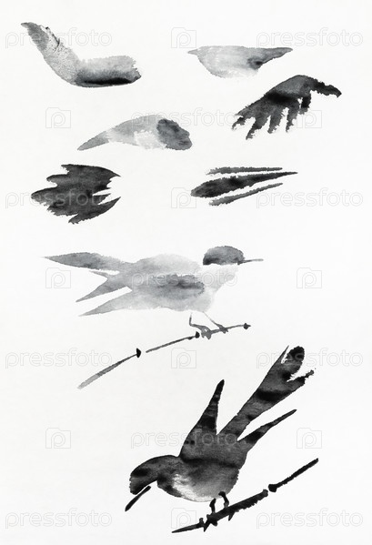 Эскизы птиц и крыльев, нарисованные от руки черными чернилами