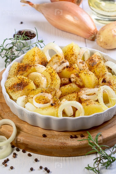 Ломтики сырого картофеля и лука со специями