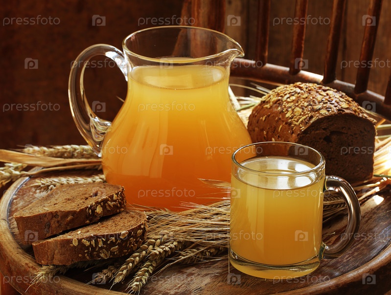 Домашний квас на деревянном фоне с колосками и ржаным хлебом