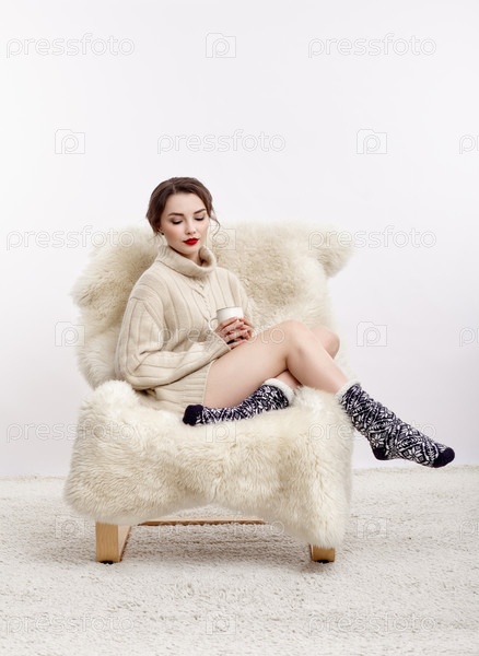 Брюнетка на пушистом кресле с чашкой кофе в руках