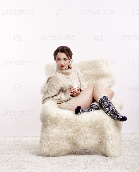 Брюнетка на пушистом кресле с чашкой кофе в руках