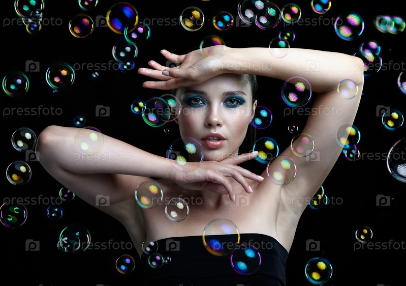 Красивая молодая брюнетка с мыльными пузырями на черном фоне