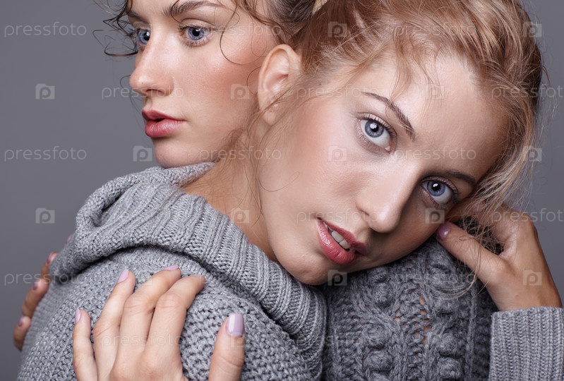 Две молодые женщины в серых свитерах на сером фоне. Красивые девушки протягивают руки в объятиях. Концепция женской дружбы