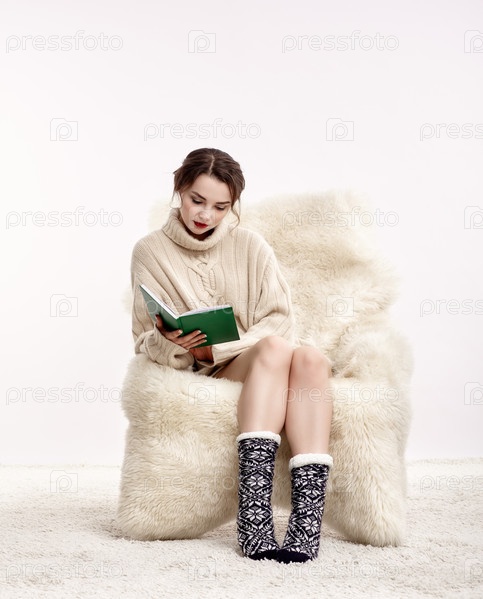 Брюнетка на пушистом кресле с книгой в руках