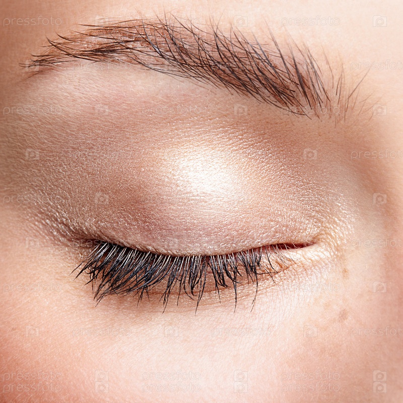 Макрофотография крупным планом закрытого человеческого женского глаза с естественным дневным макияжем лица