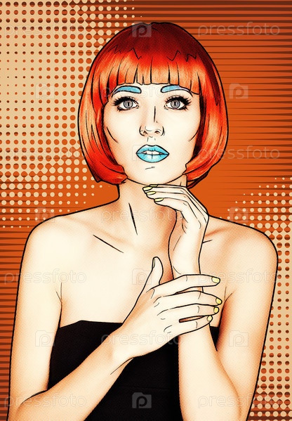 Портрет молодой женщины в стиле комического поп-арта. Женщина в красном парике на желто-оранжевом мультяшном фоне