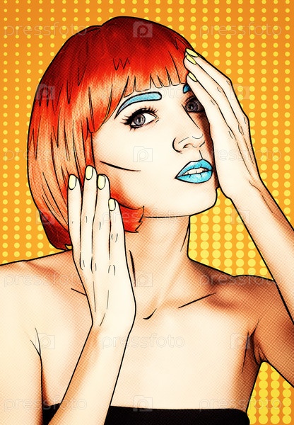 Портрет молодой женщины в стиле комического поп-арта. Женщина в красном парике на желто-оранжевом мультяшном фоне