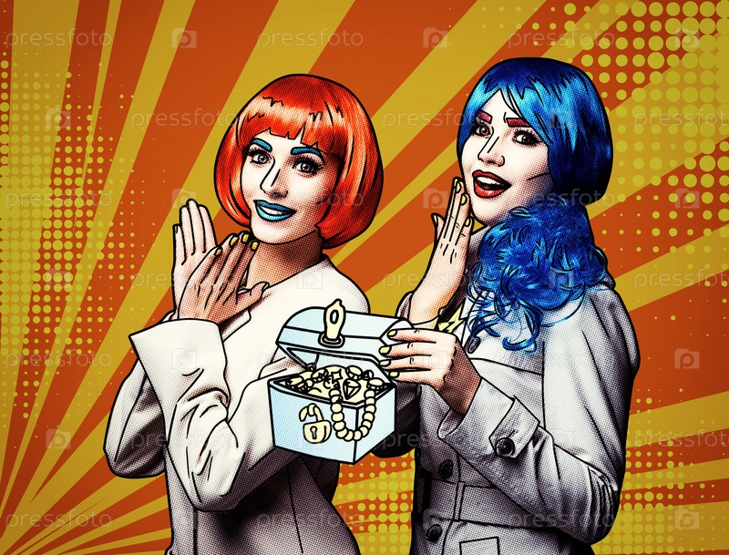Портрет молодых женщин в стиле комического поп-арта на желто-оранжевом мультяшном фоне