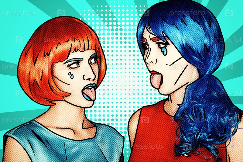 Женщины в красных и синих париках на синем фоне. Девушки показывают друг другу языки