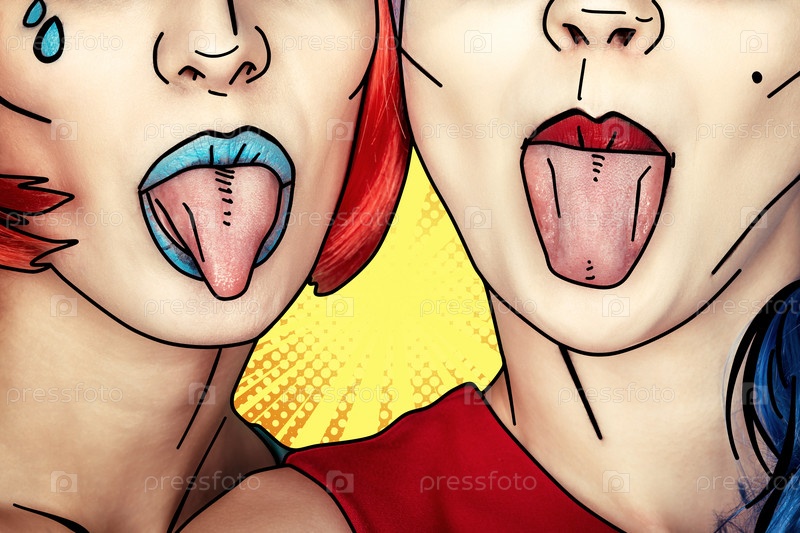 Женщины в красных и синих париках. Девушки показывают друг другу языки