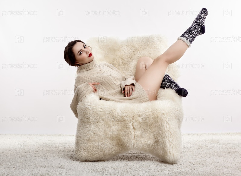 Брюнетка на пушистом кресле с поднятой ногой