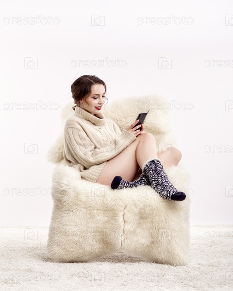 Брюнетка на пушистом кресле с телефоном в руках