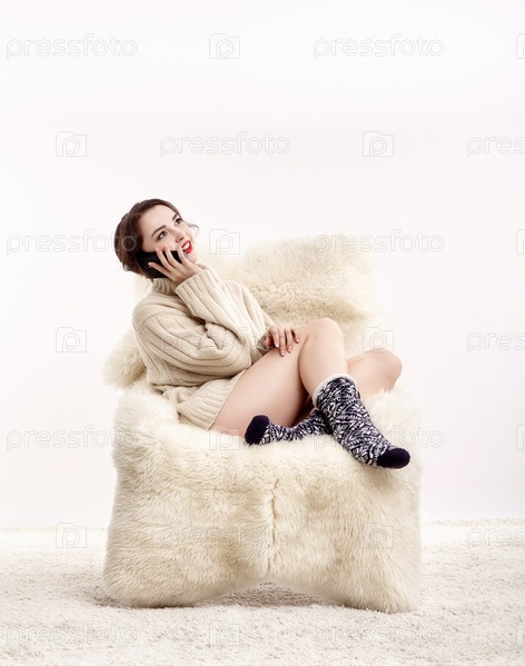 Брюнетка в пушистом кресле звонит по телефону