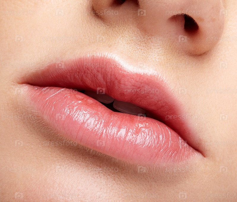 Крупным планом макро портрет женской части лица. Губы человека с дневным макияжем. Девушка с идеальной формой пухлых губ
