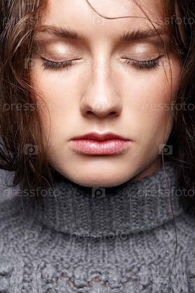 Портрет красоты молодой женщины в сером шерстяном свитере. Брюнетка с ярко-голубыми глазами и дневным женским макияжем